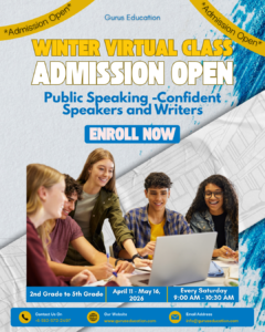 This is an extremely helpful course that teaches young students how to present and write speeches, poems, and stories in six easy steps. The students learn how to structure their many ideas and express them with confidence. With topics of their interests and our encouraging them to use props, stories, jokes, and pictures, we make learning all this easy and exciting! Children have a lot of fun in writing rhyming poems, stories from pictures, and much more.